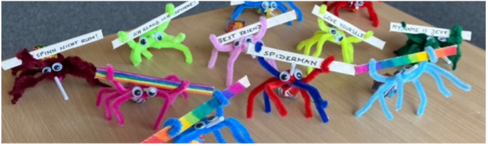 Auch viele, in mühsamer Bastelarbeit, entstandene Armbänder, Lesezeichen und Schlüsselanhänger wechselten den Besitzer. Großer Beliebtheit erfreuten sich auch die Lolli-Spinnen. Die Schülerinnen und Schüler erwiesen sich als wahre Verkaufs- und Schmuckberatungstalente.