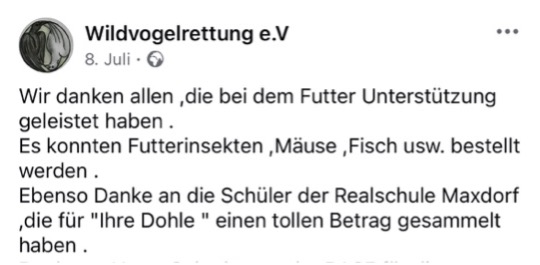 Vielen Dank an alle, die diese Spendenaktion für die Wildvogelrettung Bad Dürkheim so tatkräftig unterstützt haben: die Schulleitung, die bereit war, den organisatorischen Rahmen möglich zu machen, Herrn Caminati mit seinen Helfern, die das Fußballturnier vorbereitet und durchgeführt haben; Danke auch an die Schülerinnen, Schüler und Eltern, die Materialien besorgt, gebastelt, gebacken und auch fleißig gekauft haben ebenso wie an die Lehrerinnen, Lehrer und Sekretärinnen für ihre Unterstützung!